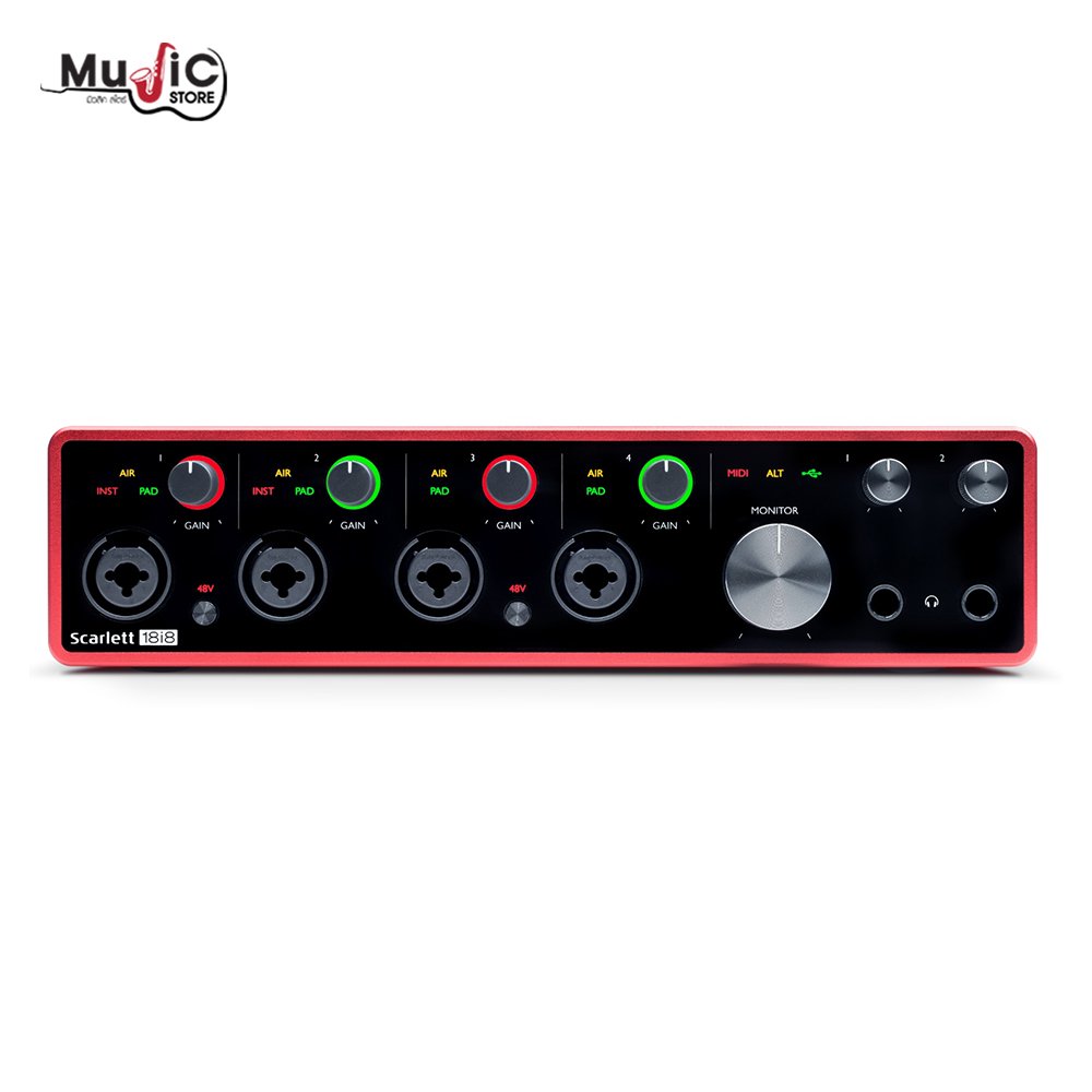 ออดิโออินเทอร์เฟซ Focusrite Scarlett 18i8 เจน 3 รุ่นท็อประดับโปรเฟสชันนอล มี 18 อินพุต 8 เอาต์พุต พร้อมพรีแอมป์ 4 ตัว เหมาะสำหรับสตูดิโอที่ต้องการบันทึกเสียงหลายช่องพร้อมกัน เช่น บันทึกวงดนตรีสด หรือกลองชุด