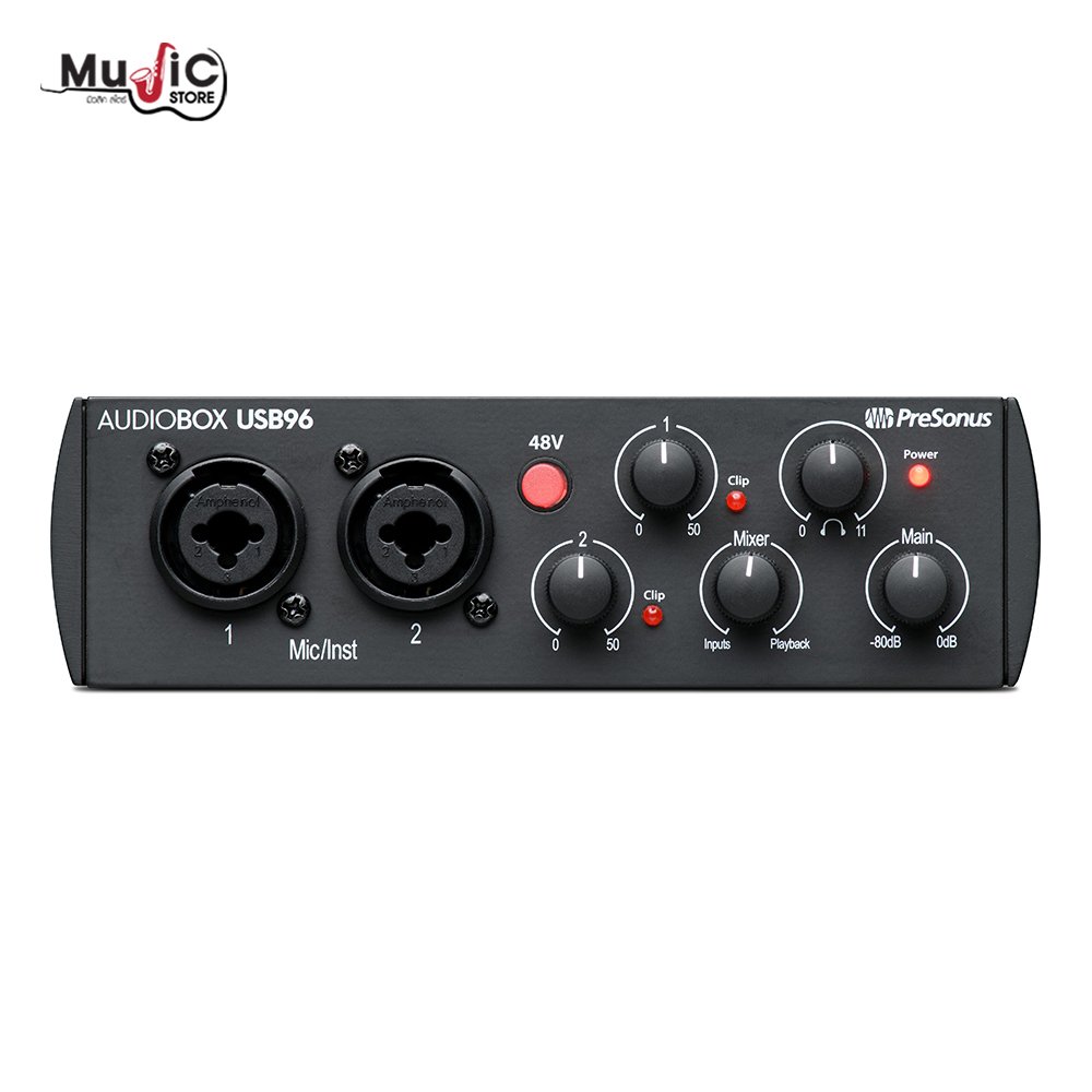 ออดิโออินเทอร์เฟซจากค่าย PreSonus รุ่น AudioBox USB 96 อินเทอร์เฟซขายดีรุ่นประหยัด มี 2 อินพุต 2 เอาต์พุต ใช้งานง่าย ทนทาน เหมาะสำหรับผู้เริ่มต้นที่ต้องการบันทึกเสียงคุณภาพดี