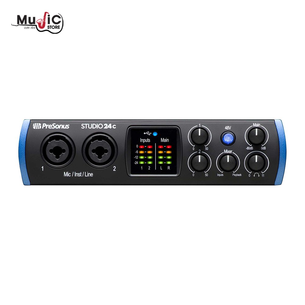 ออดิโออินเทอร์เฟซจากค่าย PreSonus รุ่น Studio 24c เชื่อมต่อ USB-C มี 2 อินพุต 2 เอาต์พุต พร้อมพรีแอมป์ XMAX-L คุณภาพสูง รองรับ 24-bit / 192kHz ดีไซน์ทันสมัย ใช้งานง่าย